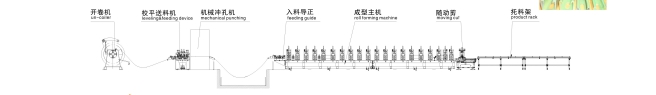 上料平臺(tái)—開卷機(jī)—伺服送料—沖孔沖壓—輥壓成型—切斷—翻轉(zhuǎn)送料