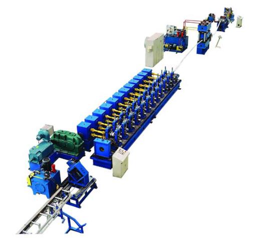輕軌、地鐵導(dǎo)軌不銹鋼帶冷彎生產(chǎn)線由開卷機(jī)、入料導(dǎo)正、校平機(jī)、切頭機(jī)(對焊)、送料機(jī)、沖孔機(jī)、壓印機(jī)、輥壓成型機(jī)、成型剪、出料架、液壓系統(tǒng)、電氣控制系統(tǒng)組成,生產(chǎn)線速度:3-6m/min。